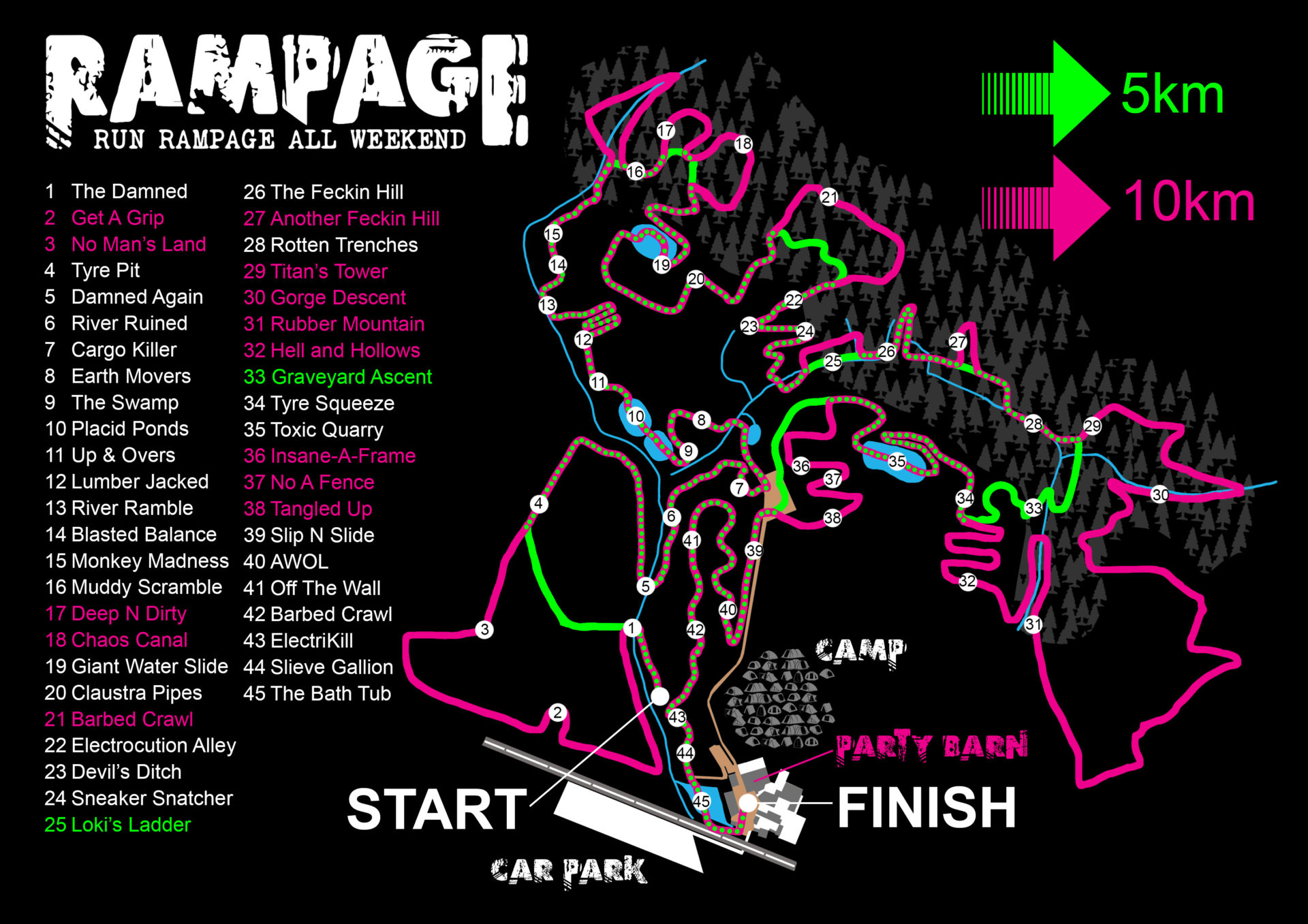 Thank you to everyone who’s been brave enough to sign up or sign their little ones up for our first ever Rampage Run. This is sure to be a fantastic event. We’re incredibly excited to put you all through our specially designed obstacle course and we hope you all gain a real sense of achievement after completing it. You already have our respect for taking it on. As the event is quickly approaching we’d like to share with you some important information on the race days, how to find us, what’s involved, race procedures, rules and other information we think you might need.