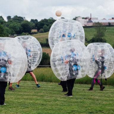 Body Zorb Football involves wearing inflatable balls that cover the upper body, allowing participants to run, bounce, and collide safely while playing football.